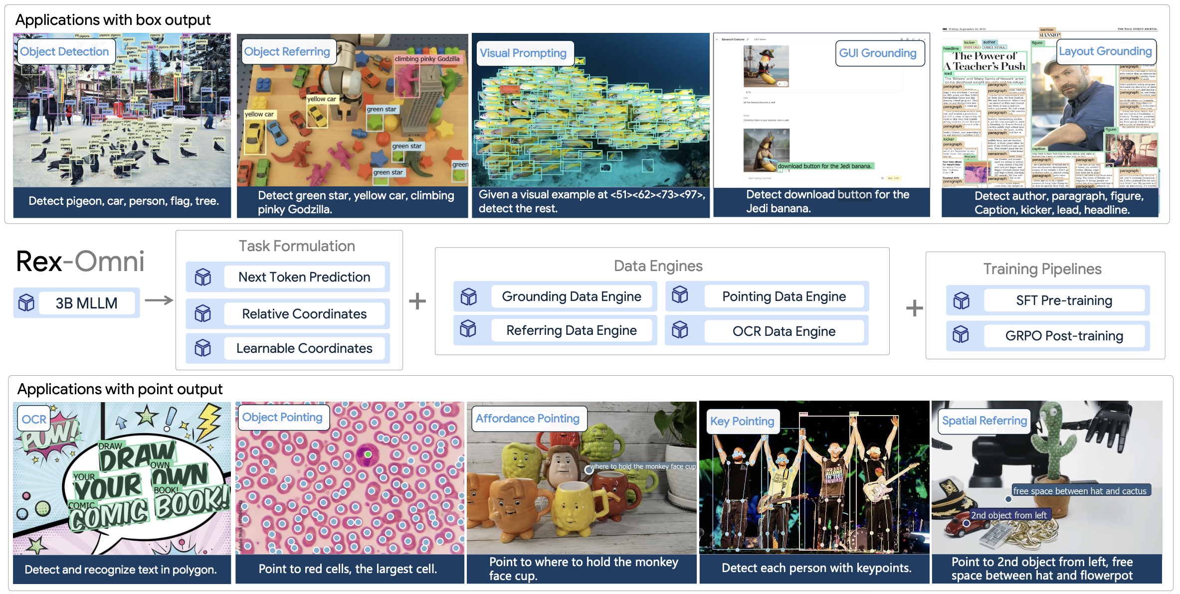 Rex-Omni is a 3B-parameter Multimodal Large Language Model (MLLM) that redefines object detection and a wide range of other visual perception tasks as a simple next-token prediction problem.