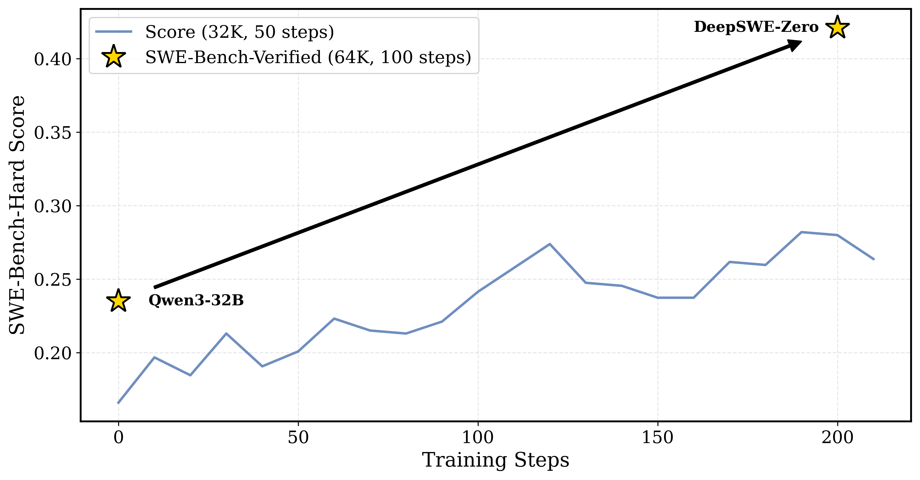 DeepSWE-Preview is trained on top of Qwen3-32B with thinking mode enabled. With just 200 steps of RL training, SWE-Bench-Verified score increases by ~20%.
