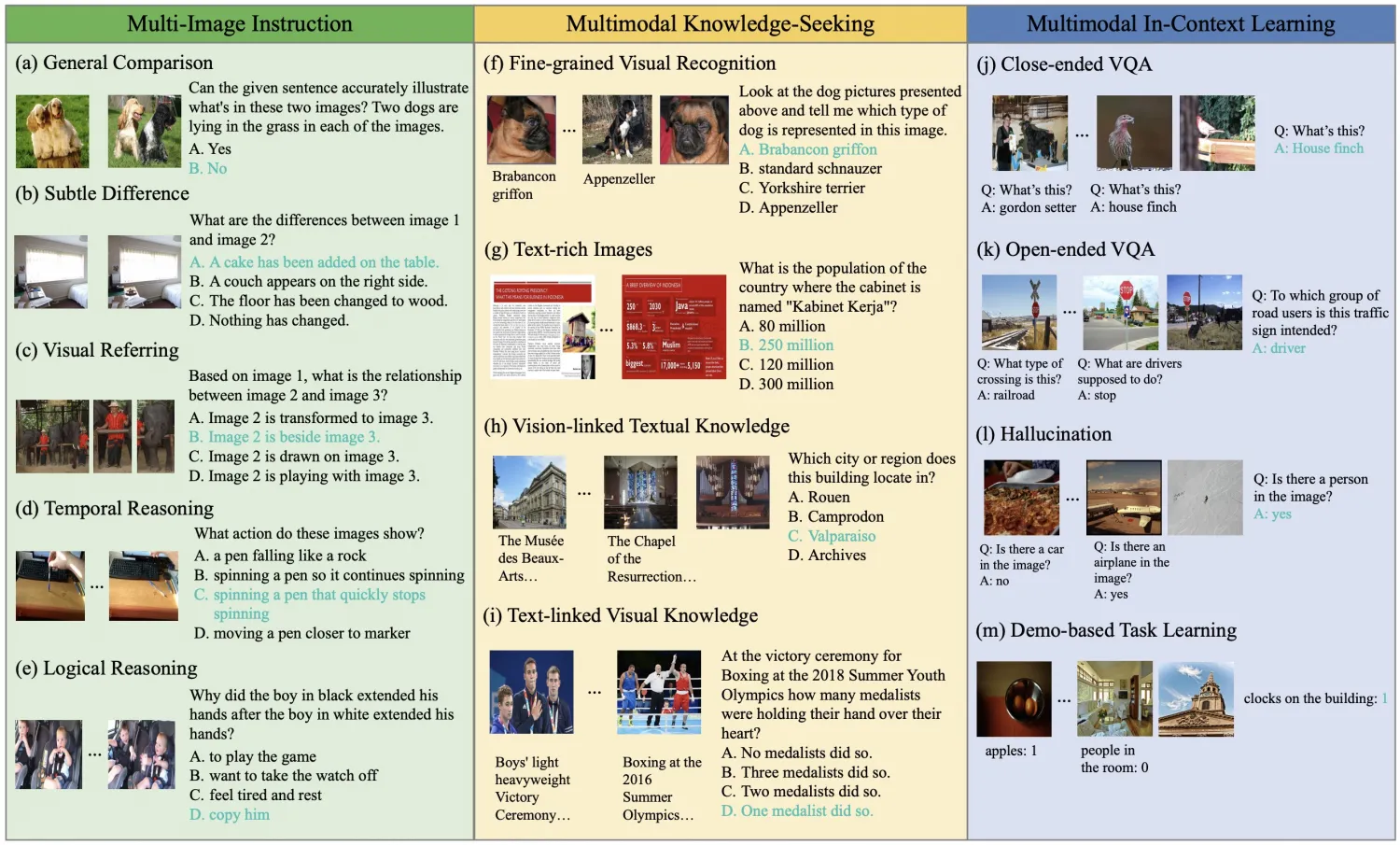 The following image shows the examples of the multi-image scenarios with a total of 13 sub-tasks. The correct answers are marked in blue.